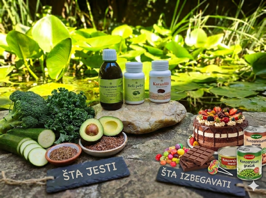 Edukativni prikaz pravilne ishrane tokom detoksikacije. Na levoj strani su brokoli, avokado i laneno seme kao preporučena hrana, dok su na desnoj strani torta, čokolade i konzerve koje treba izbegavati radi boljih rezultata čišćenja.